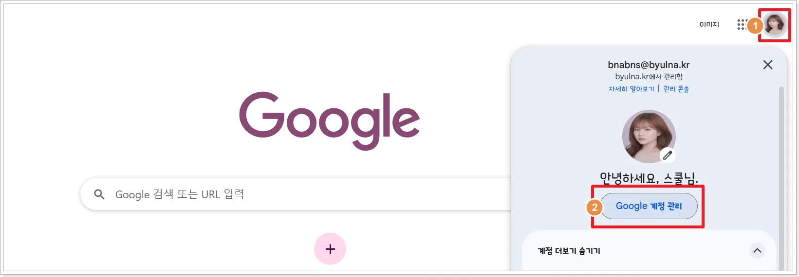 ↓ 크롬 브라우저에 로그아웃 할 계정으로 로그인 후 상단에 프로필 → 계정관리를 클릭합니다.↓
