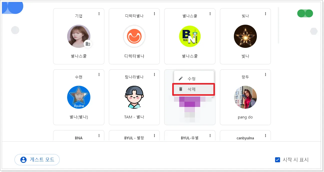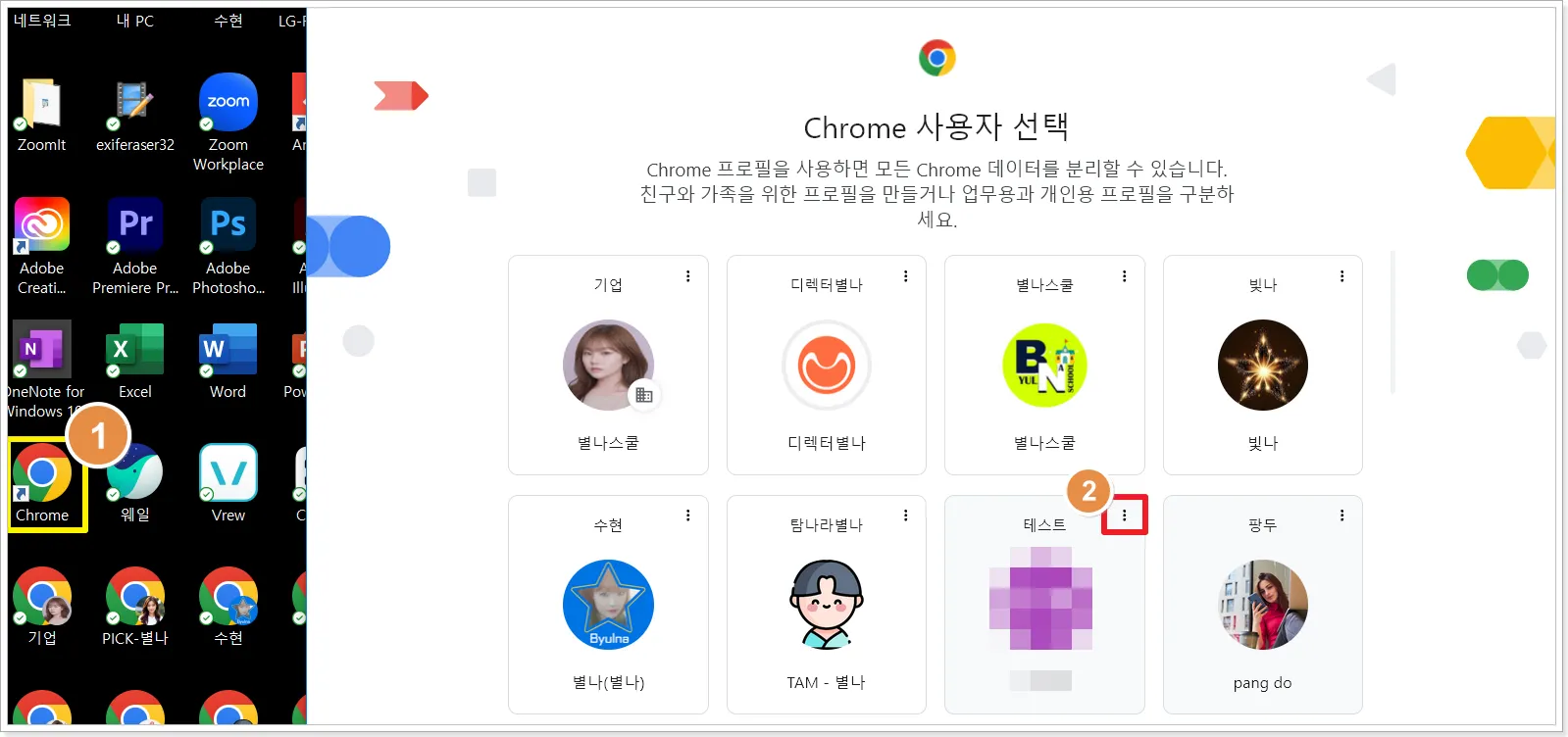 ↓ 바탕화면에 크롬 브라우저를 선택한 후 삭제하고자 하는 계정의 점 세개 메뉴를 클릭합니다. ↓