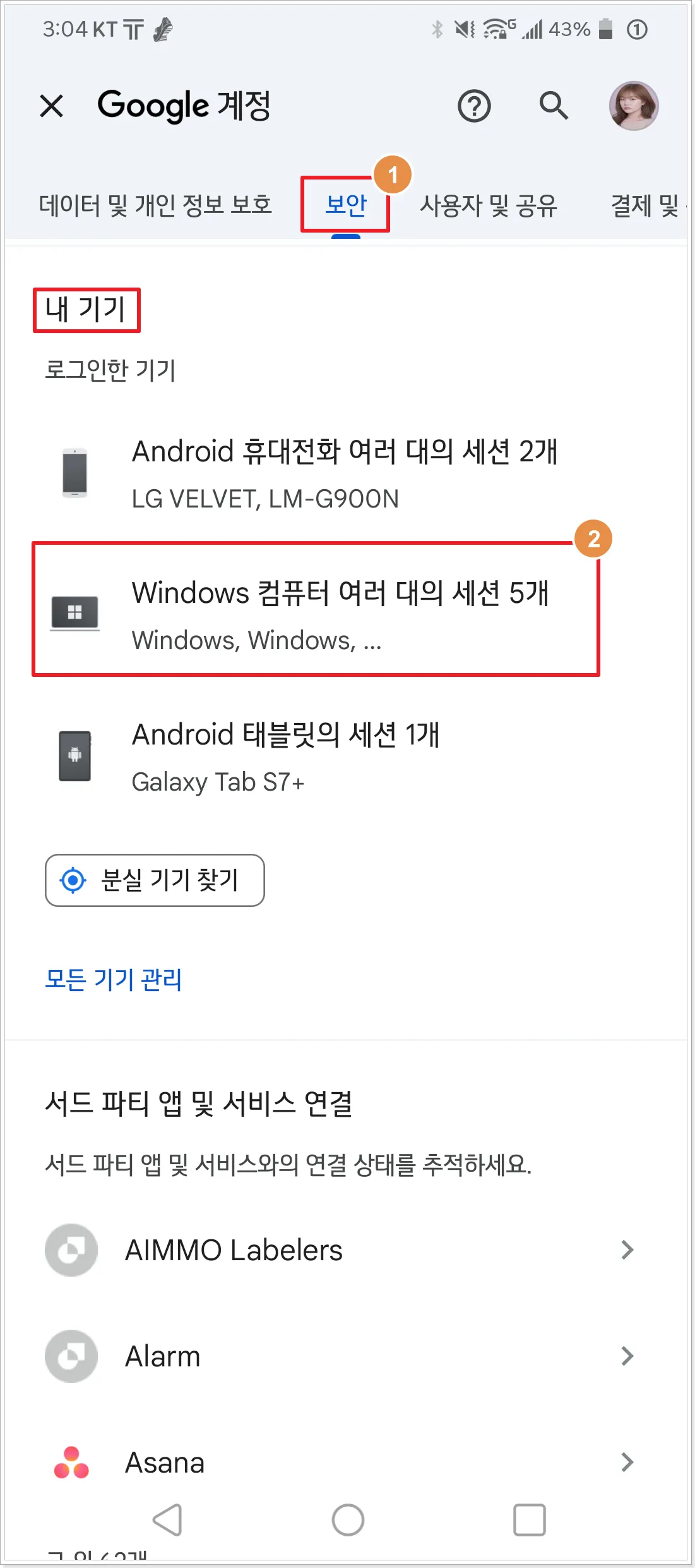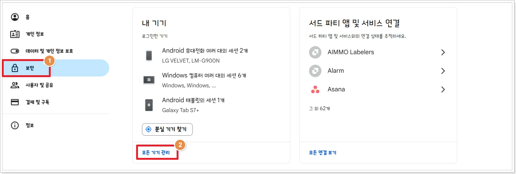 ↓ 좌측 메뉴에서 “보안” → 중간에 보이는 내기기 → 모든 기기 관리를 클릭합니다.↓