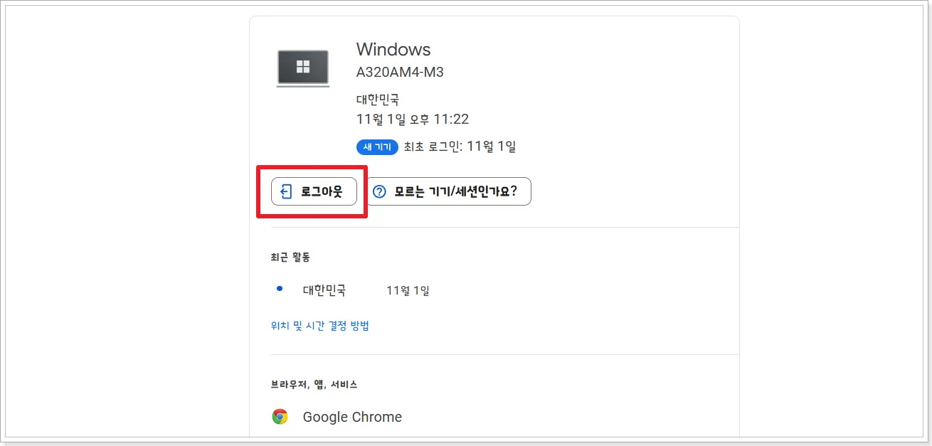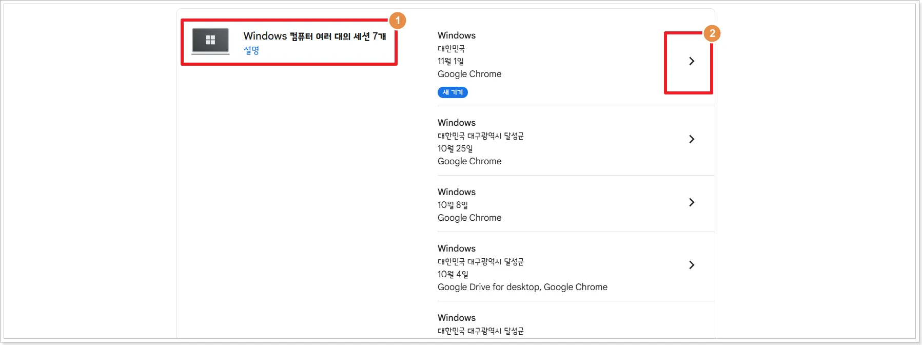 ↓ 내 기기 중 컴퓨터 세션을 클릭하여 로그아웃 하고자하는 윈도우를 선택합니다.↓