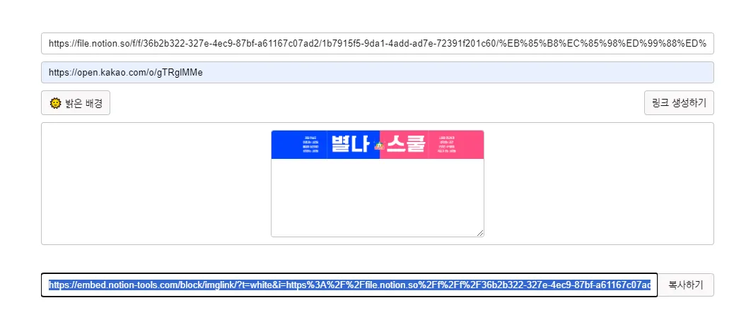 복사하기 버튼을 눌러 복사 후 이미지 링크를 등록할 노션 페이지로 이동하여 임베드로 등록합니다.