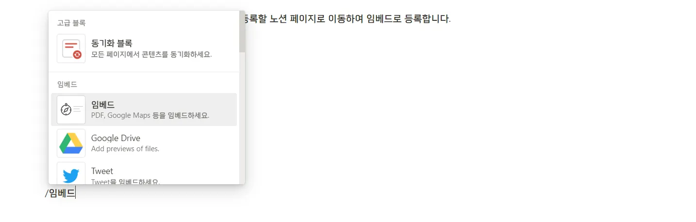 / 를 눌러 임베드라고 검색을 하면 위 화면처럼 보입니다. 임베드를 클릭합니다.