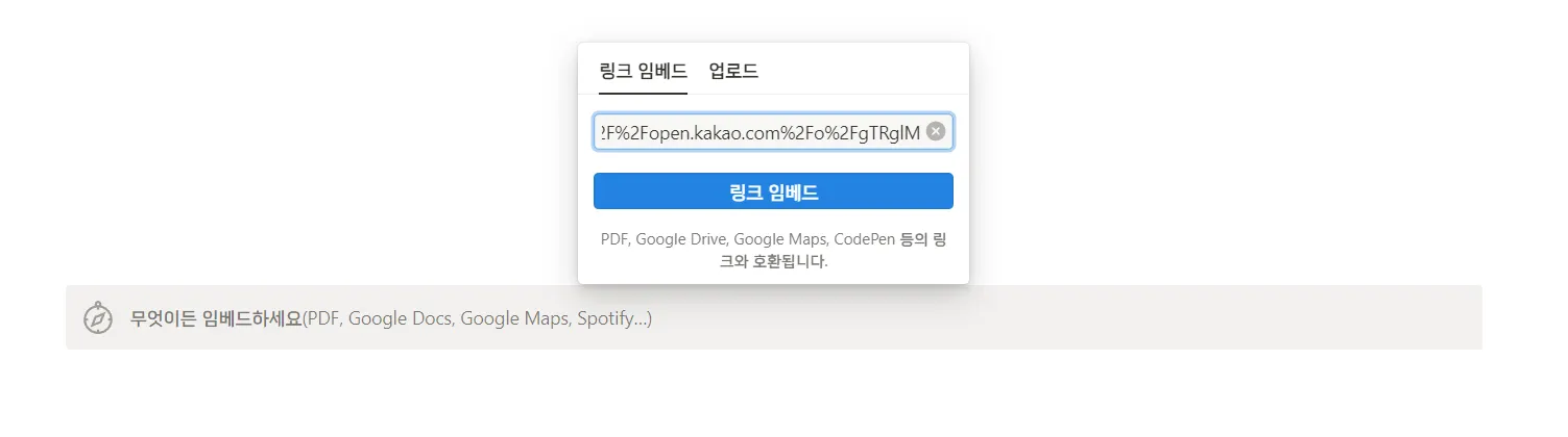 링크 임베드를 선택 후 이미지링크 블록 만들기에서 복사한 주소를 붙여넣기 후 링크 임베드를 클릭합니다.