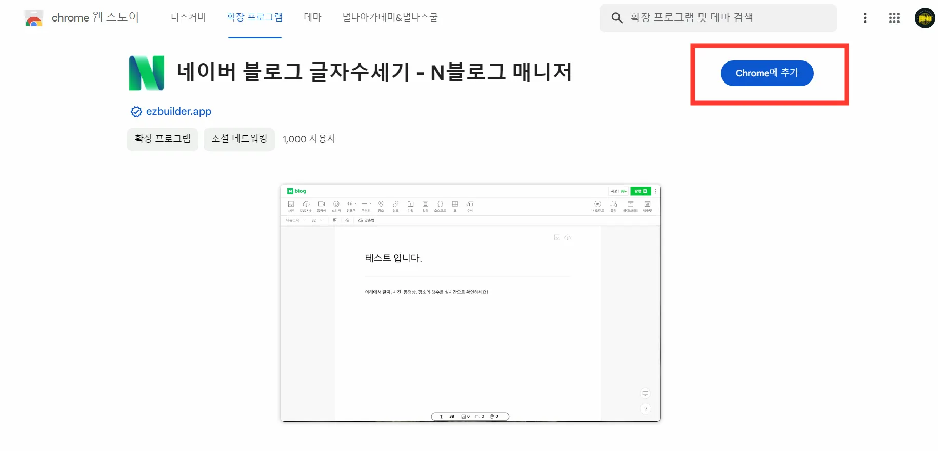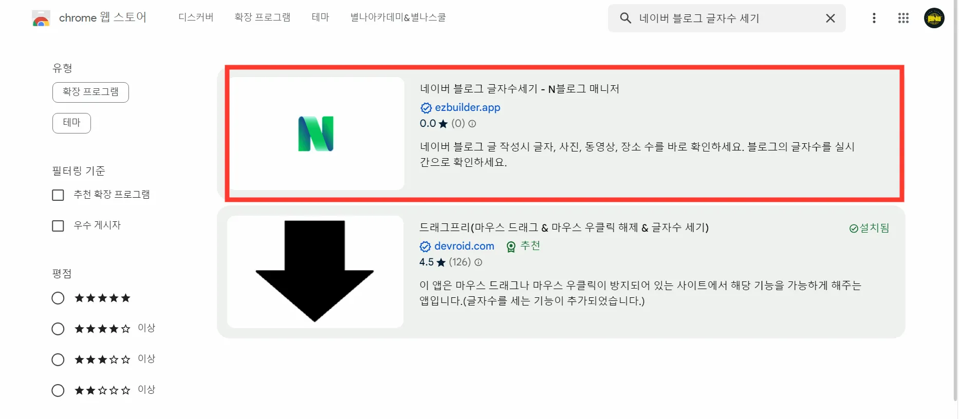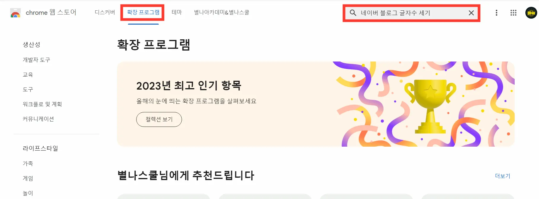 호환 스토어를 클릭하면 아래 화면처럼 보입니다. “확장프로그램” 선택 후 검색창에 “ 네이버 블로그 글자수 세기” 라고 입력 후 검색해보세요.