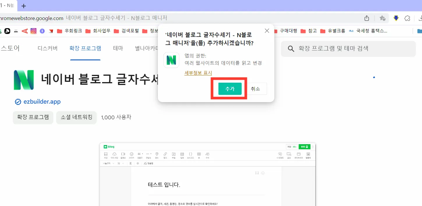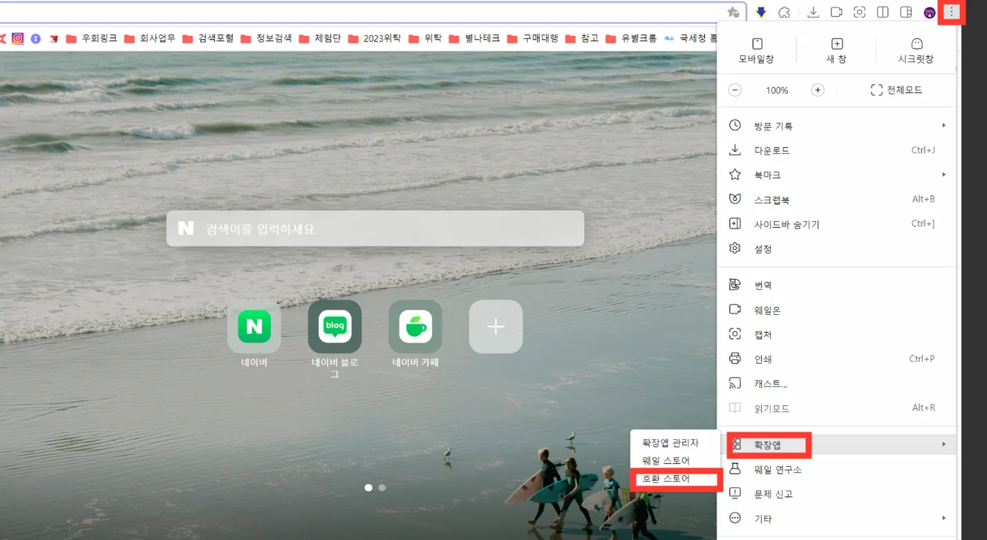 링크를 통해 확장프로그램을 바로 설치할 수 있으며 구글이라면 크롬 확장프로그램에서 검색 후 설치할 수 있고, 네이버 웨일에서 설치하려면 점 세개를 클릭 후 확장앱 → 호환 스토어에서 설치할 수 있습니다.