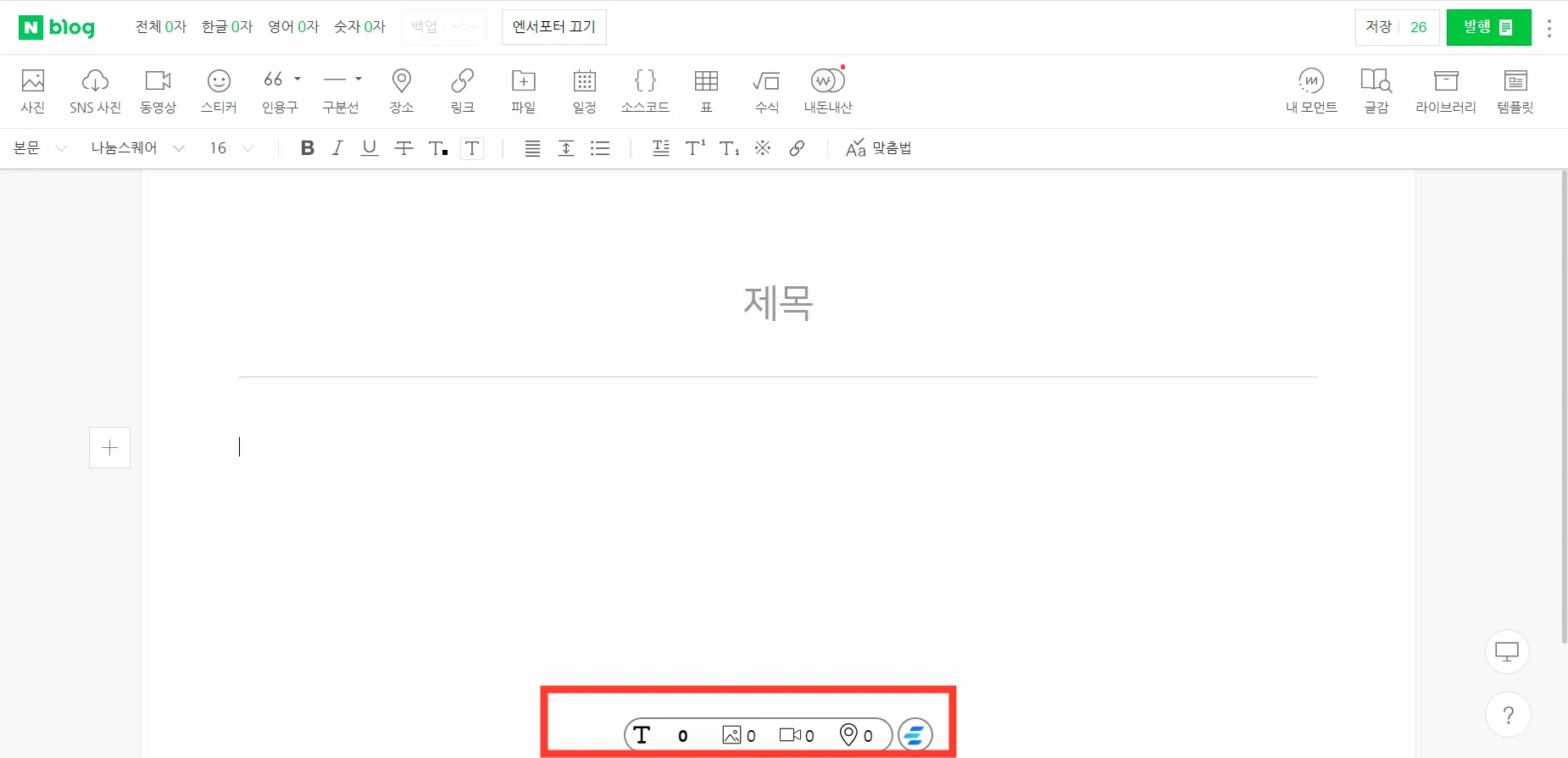이제 네이버 블로그 글쓰기 화면으로 이동하면 못보던 도구가 하단에 보일겁니다.