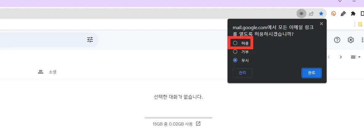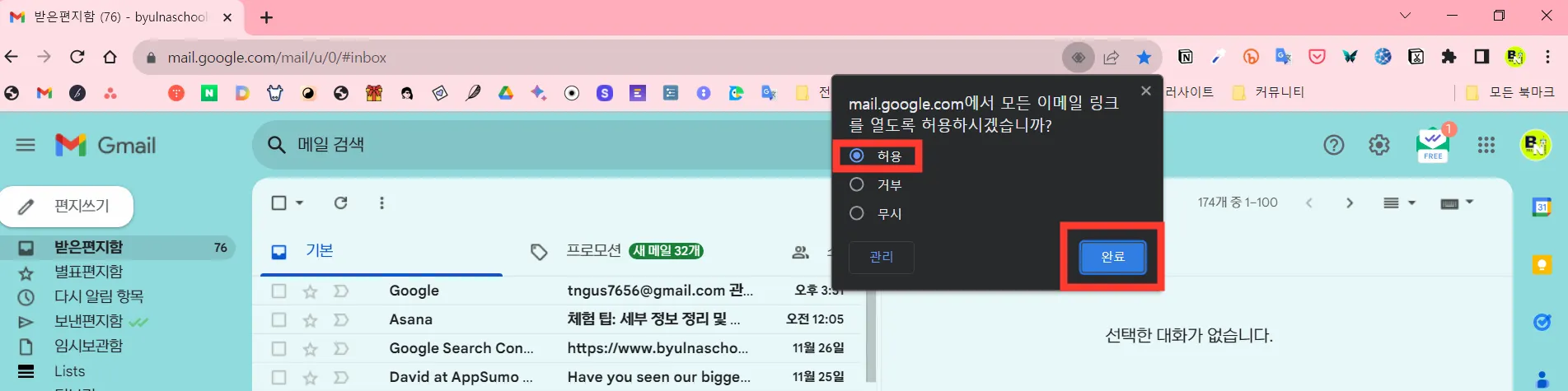 이제 허용을 클릭 후 완료를 눌러줍니다. mailto: 를 입력 후 메일을 진행할 경우 크롬에서 진행할 경우 지메일로 바로 이동하게 됩니다.