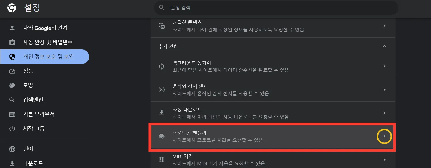 “프로토콜 핸들러” 라는 메뉴가 보입니다. 삼각형 모양을 클릭해주세요.