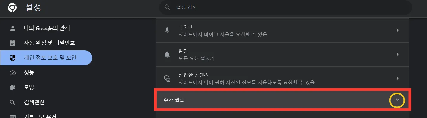 화면을 스크롤하면 중간에 “추가권한” 이라는 메뉴가 보입니다. 우측에 있는 화살표를 내려보세요.