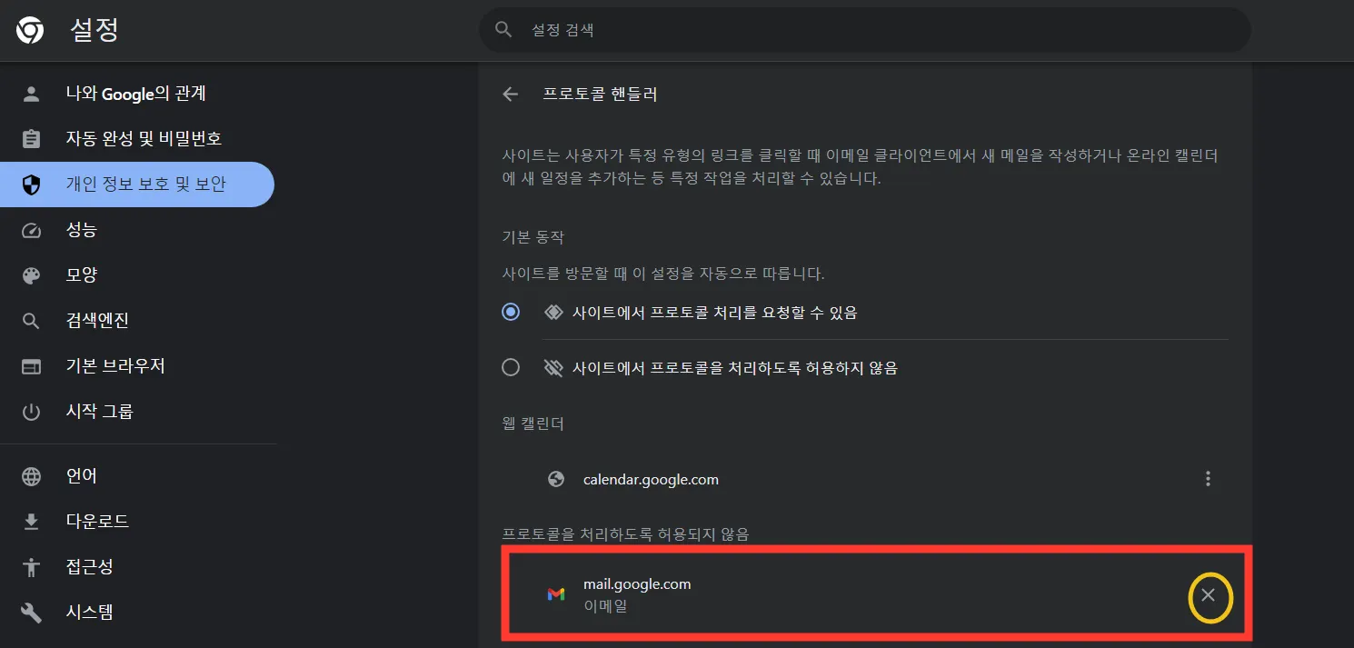 프로토콜을 처리하도록 허용되지 않음에 지메일이 있습니다. x 표시로 지워줍니다.
