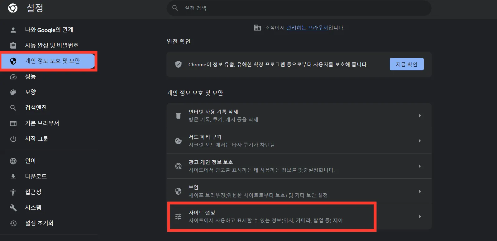클릭 후 아래쪽에 “사이트 설정”을 선택합니다.
